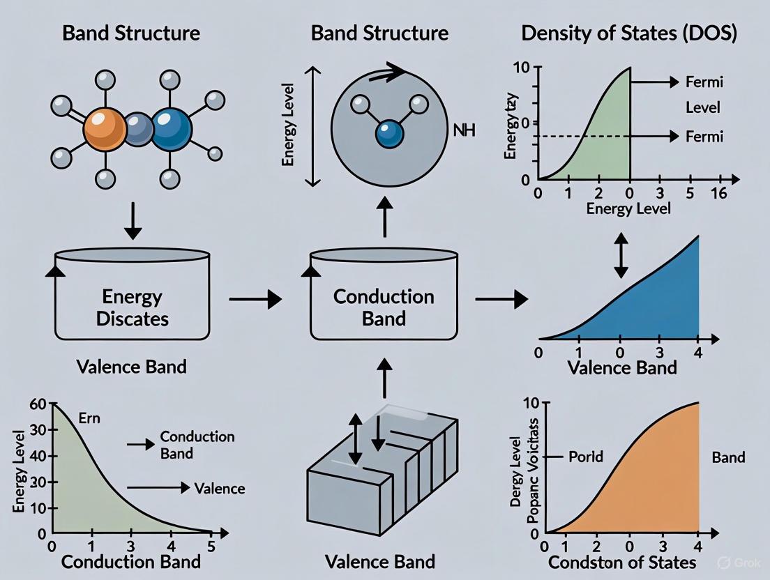 | Band Gap | Energy difference between CBM and VBM. | Energy range where DOS is zero. |