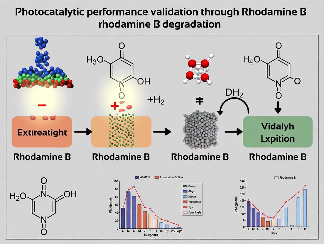 The systematic validation of photocatalytic performance through RhB degradation provides critical insights for developing efficient environmental remediation technologies. Key advancements in material science, particularly through doping, nanocomposite design, and surface engineering, have significantly enhanced degradation efficiency and catalyst stability. The adoption of standardized benchmarking protocols and quantitative performance metrics is essential for meaningful cross-study comparisons and accelerating technology transfer from laboratory research to practical applications. Future directions should focus on developing visible-light-active materials with minimal recombination losses, establishing universally accepted testing standards, and exploring applications beyond environmental remediation, including antimicrobial surfaces and drug degradation systems. The integration of advanced characterization techniques with robust validation frameworks will continue to drive innovation in photocatalytic research for biomedical and environmental applications.